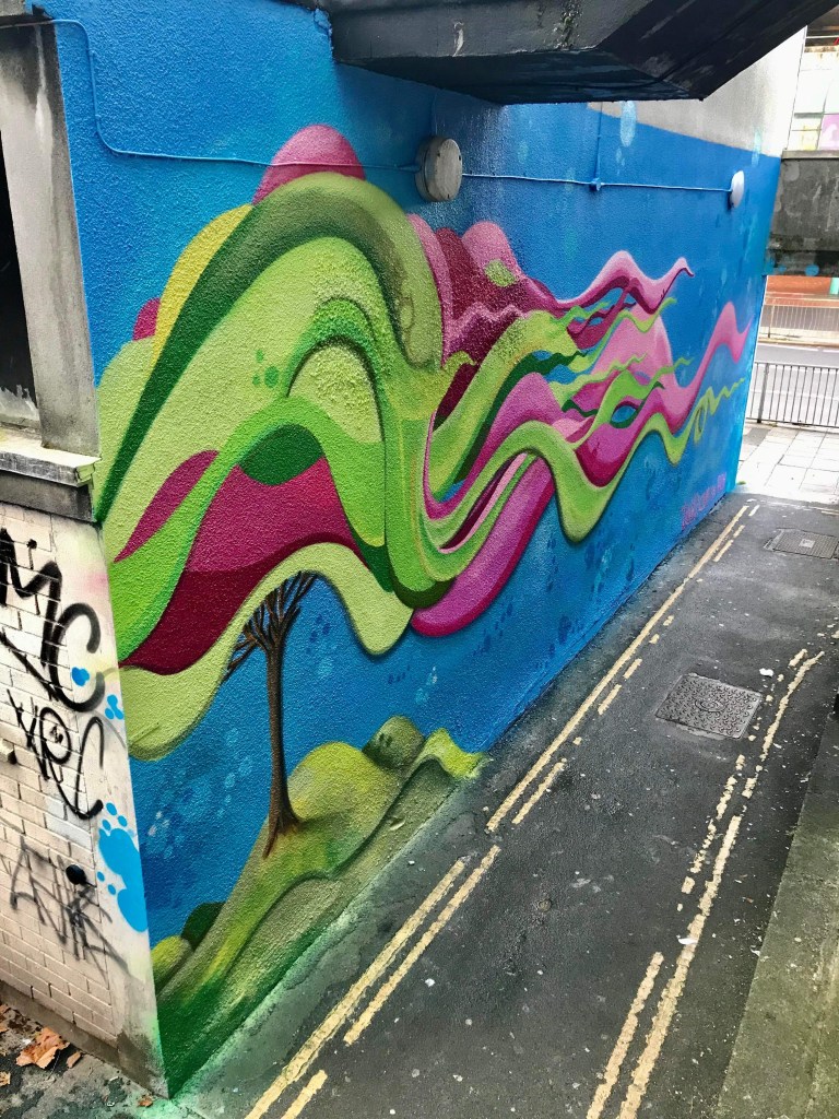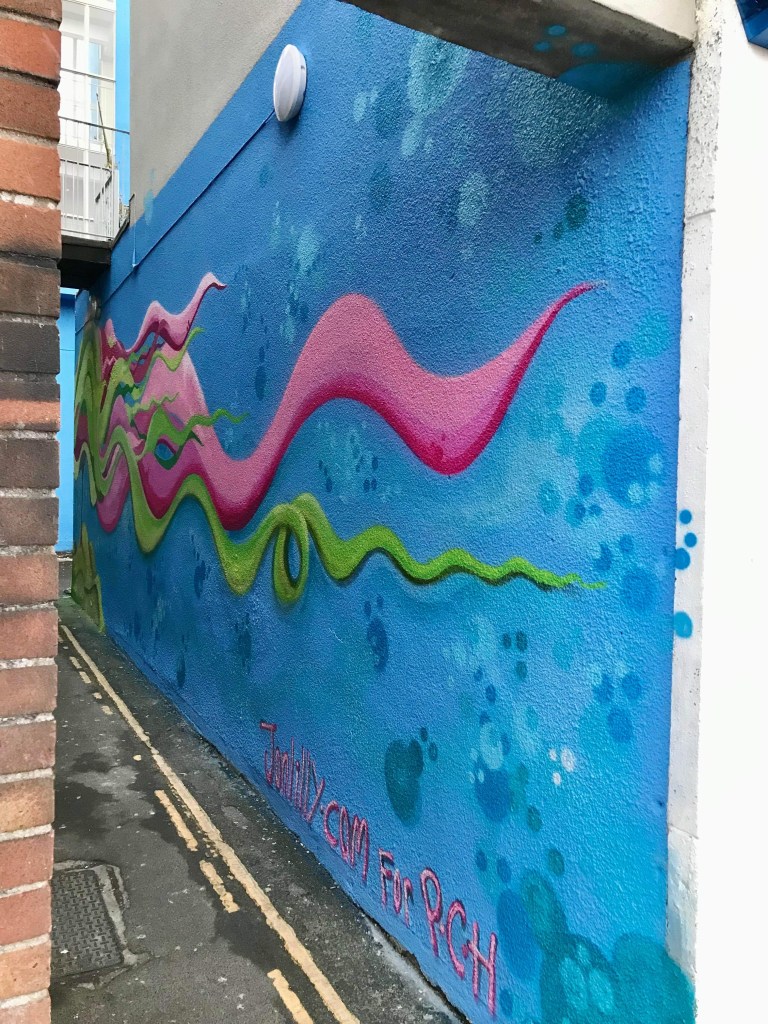 Plymouth Community Homes commissioned this mural as part of the regeneration of several areas of their housing which had begun to look rundown. I was given a wide brief of producing a bright and colourful painting, so I designed an abstract tree to have broad appeal but also allowing me to experiment with colour, moving away from the black outlines I often use in my work.
