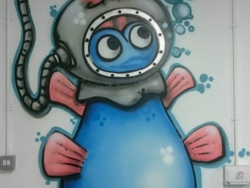 I ran workshops in Elburton Primary School with the children, where they came up with the “under the sea” theme and created the designs themselves. I drew the backgrounds, titles, octopuses (octopi?) etc. and marked out their designs on the walls like a huge painting by numbers. The children and I then brought the creation to life, painting with sprays and brushes over several days, with me finishing off using spray paint.