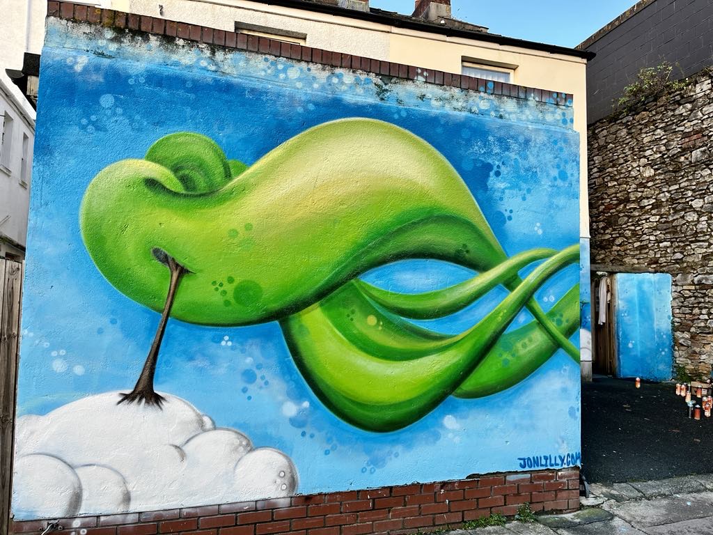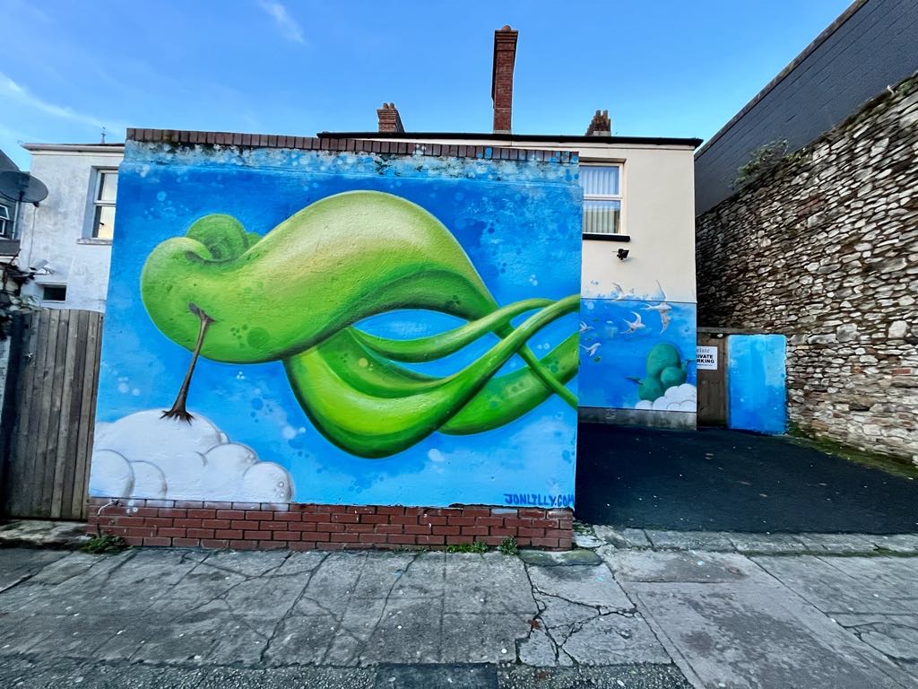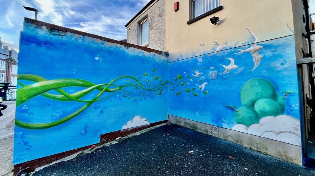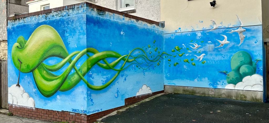 This was a commission for Relate, a relationship counselling service in Plymouth, who wanted to brighten up the outside of their building. I was given free rein in terms of design – I wanted to create something which tied in with the nature of their business, so I chose a tree which morphs into a flock of birds, reflecting themes of calm and peace.