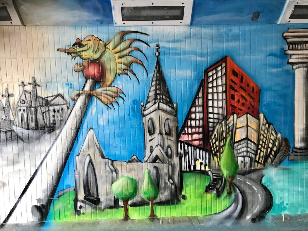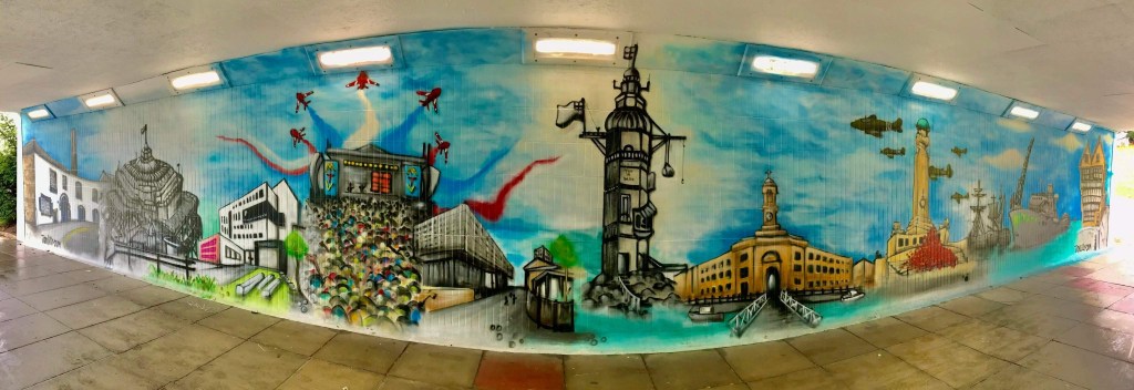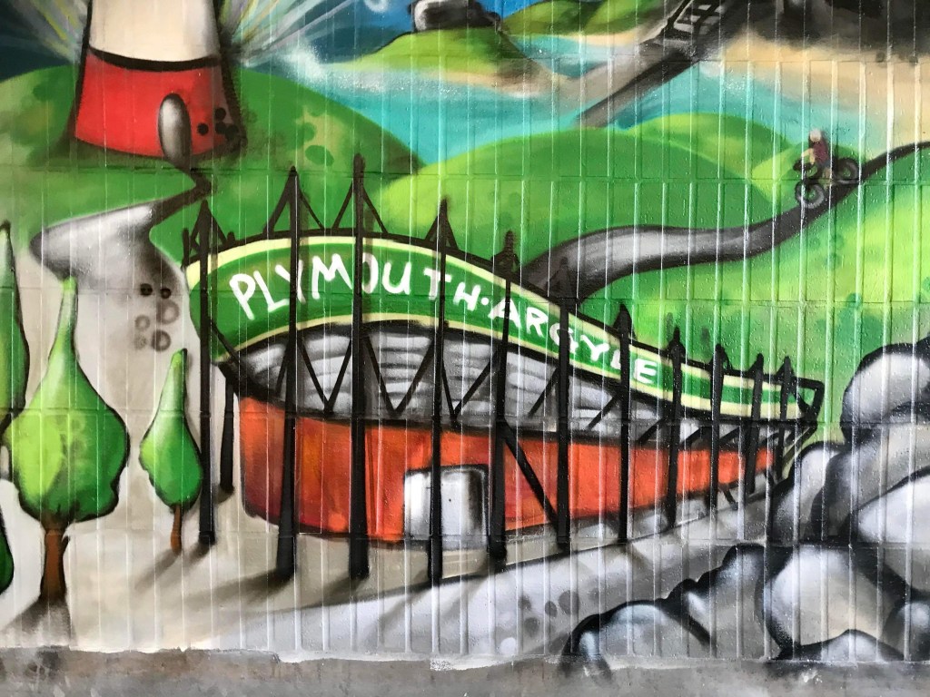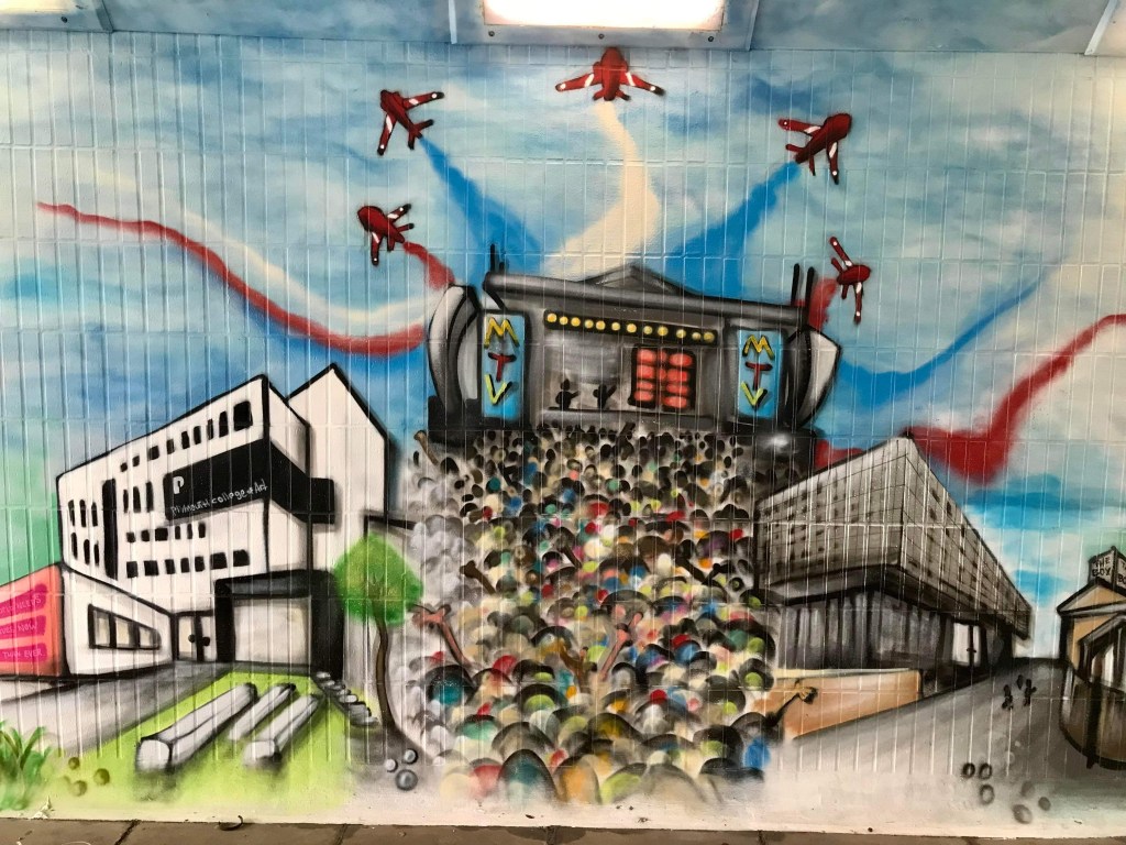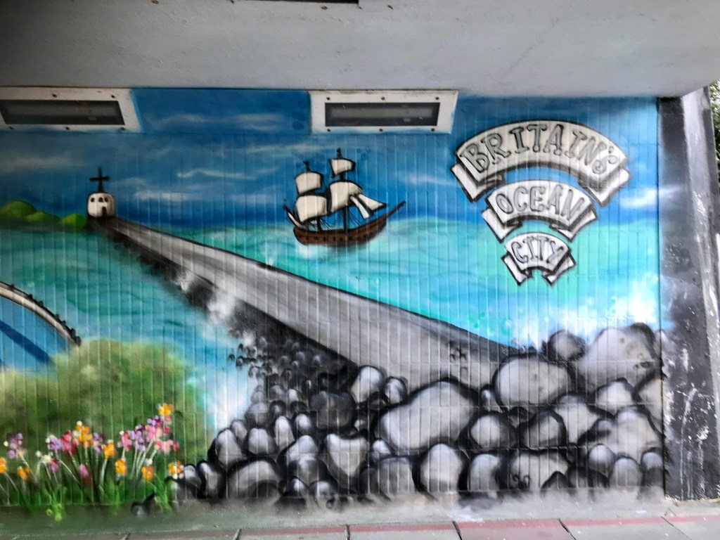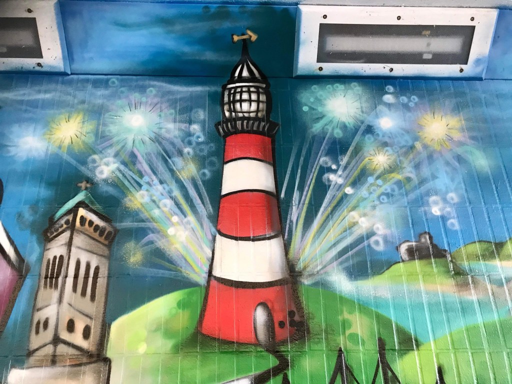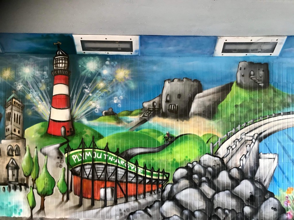 I was asked to design and paint the opposite wall in August 2021, which uses the same concept to show other famous Plymouth landmarks, sights, and cultural events, both past and present.