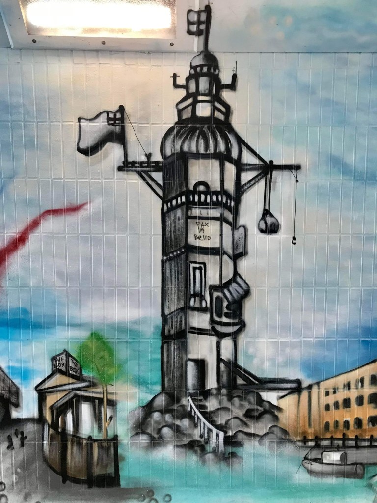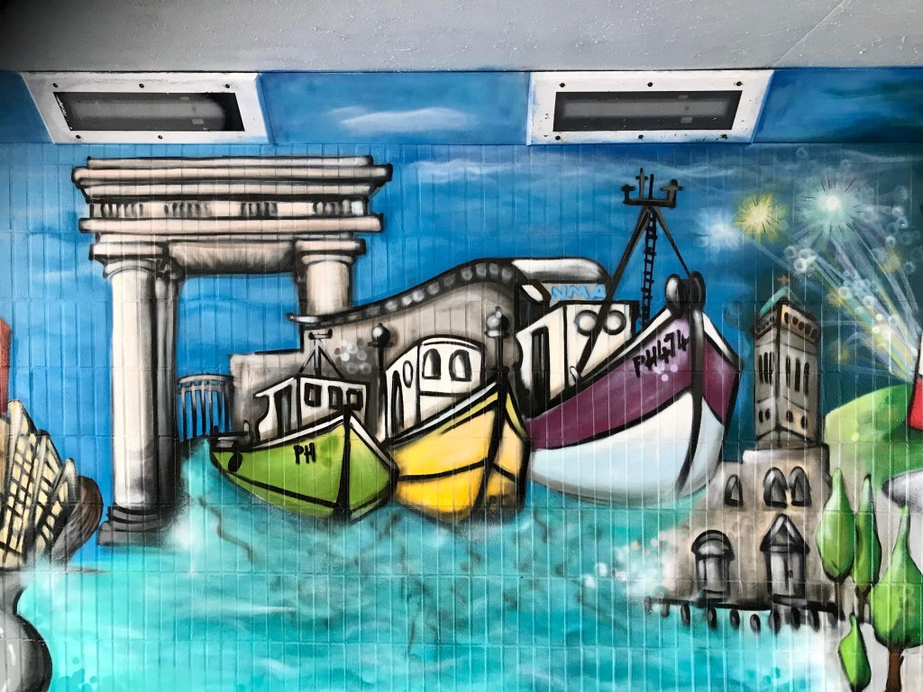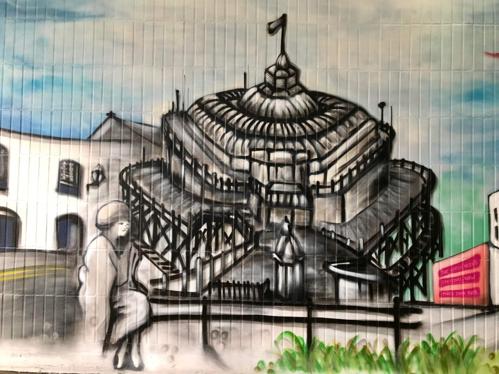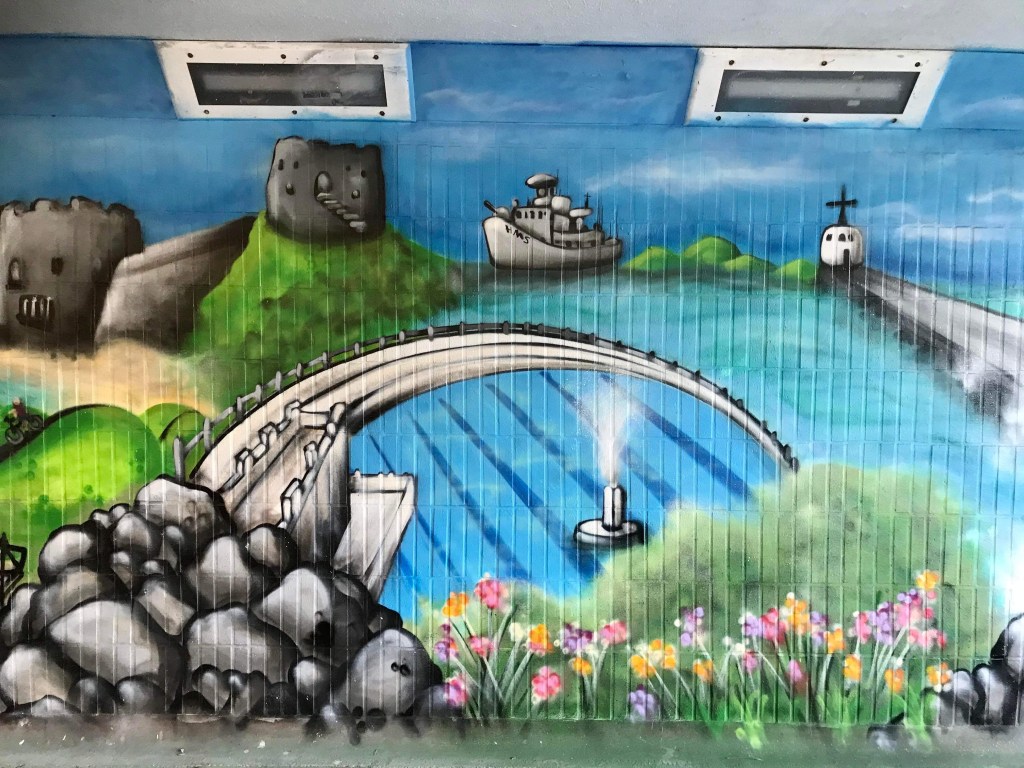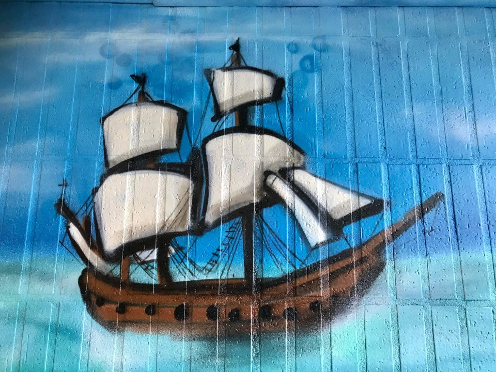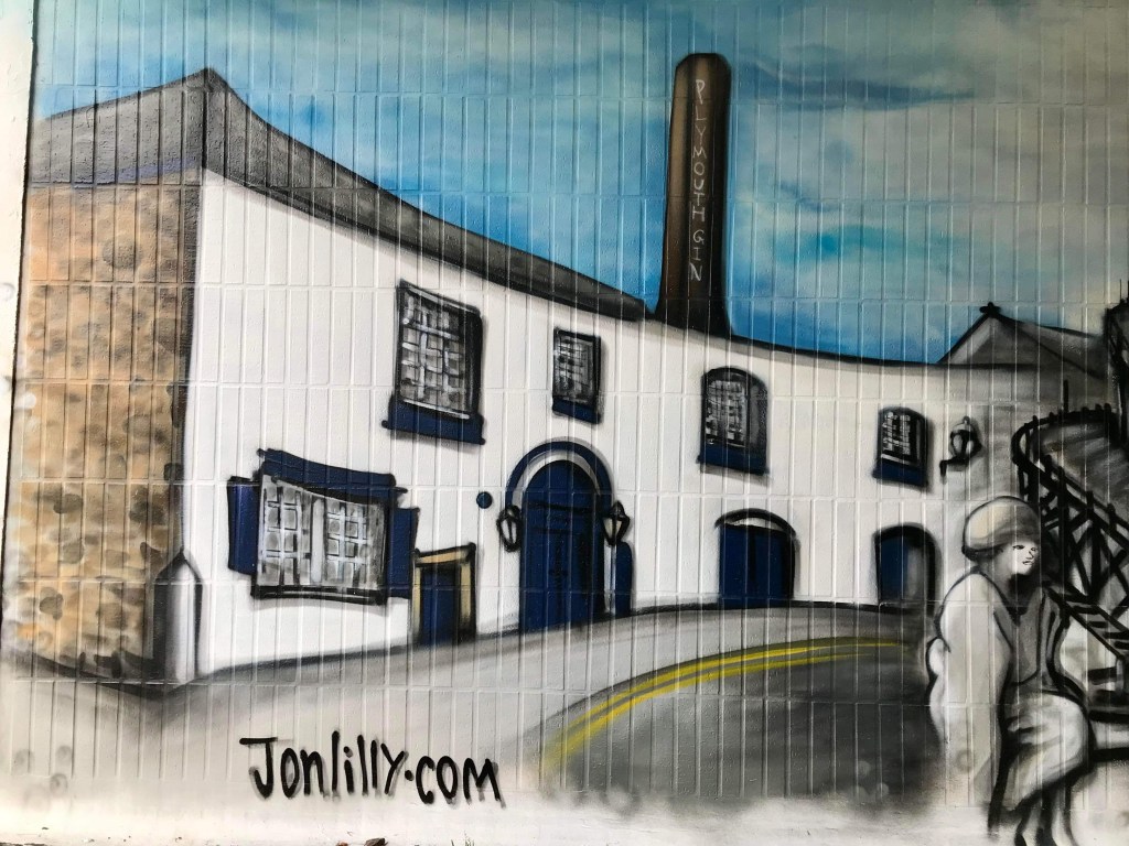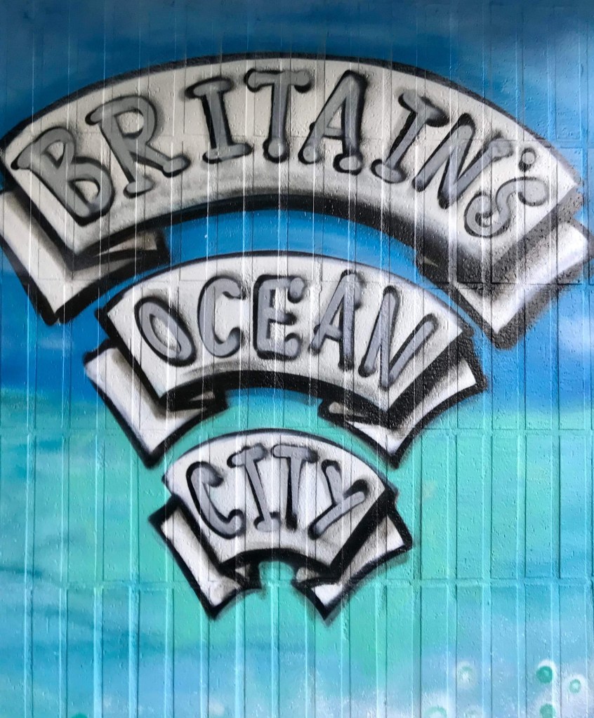 I was asked to design and paint the opposite wall in August 2021, which uses the same concept to show other famous Plymouth landmarks, sights, and cultural events, both past and present.