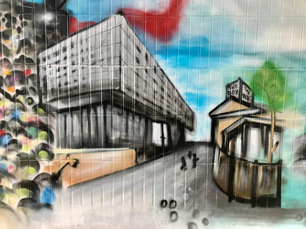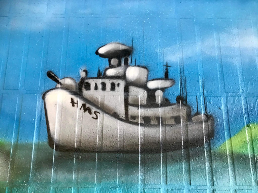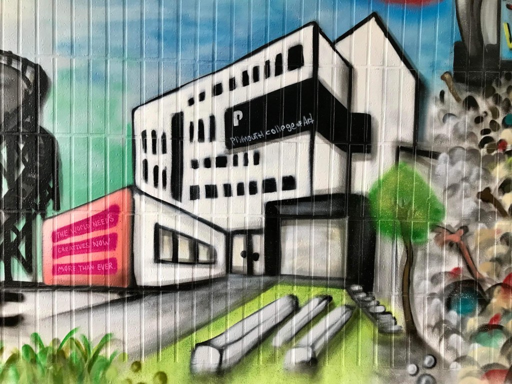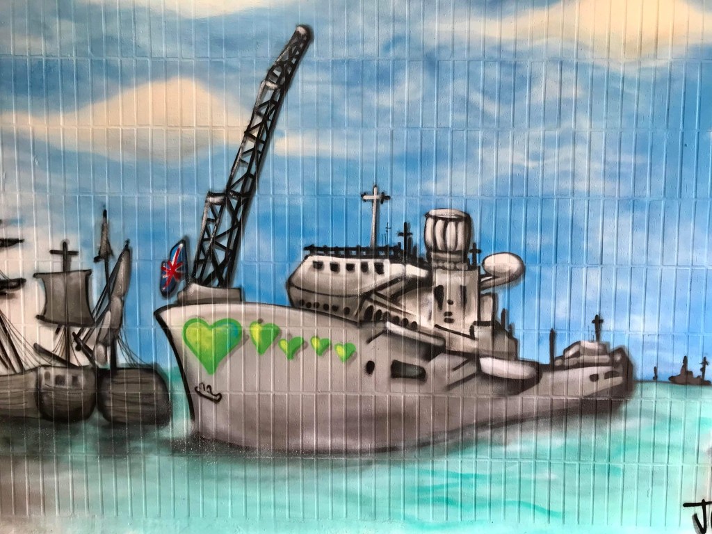I was commissioned to design and paint the first of my two ‘Welcome To Plymouth’ murals by Plymouth City Council in August 2020. I am really proud of this piece, as it is the first thing you see when you walk from the train station to the city centre. The concept is around moving through time, from the black and white images of Plymouth’s past, to the colourful images of Plymouth’s present.